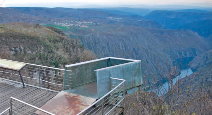 A little higher still is the balcony of Cabezoás, next to the road, in front of the Coto das Boedas. We have in front of us the deepest part of the canyon, and the last bend of the Sil in Parada do Sil, since it then continues in Nogueira de Ramuín. The opposite bank is already Sober, which belongs to the province of Lugo. The viewpoint is made up of a walkway with a wooden floor and metal railing and a small platform that rises a little higher, also metal, like a cantilever to greet. And we salute: to the right, Monforte de Lemos; to the left, small villages like Cerceda or Alberguería.
