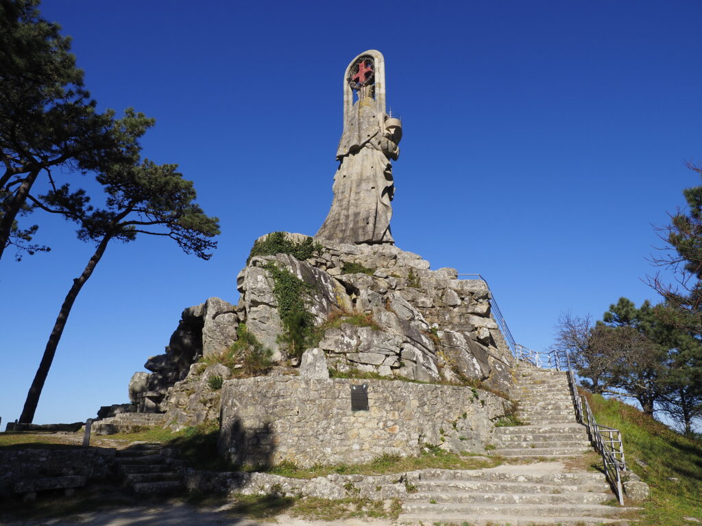 Virxe da Rocha. No concello de Baiona, nas Rías Baixas, atopamos outeiros próximos ao mar desde os que obter boas vistas. É o caso do monte Sansón ou de San Roque. Xa de por sí era un estupendo miradoiro natural mais, por que non facelo aínda máis artístico? Iso foi o que pensou o enxeñeiro Laureano Salgado, que imaxinou unha gran escultura-miradoiro da Virxe María. Axudado pola filántropa Mercedes de la Escalera, conseguiría reunir o capital para levala a cabo. En 1930 inaugurouse a escultura da Virxe da Rocha, en granito, de 15 m de altura. O deseño é de Antonio Palacios e, a cara e as mans da virxe, en mármore branco, son do escultor Ángel Garía Díaz. Esta virxe mariñeira leva un barco na man dereita. Até aquí mesmo podemos achegarnos, só temos que subir as escaleiras de caracol interiores. Ante os nosos ollos, as illas Estelas, as Cíes, Monteferro, Baiona, Nigrán, e o Atlántico, e algunhas árbores. Esta virxe é unha guía valiosa para navegantes.