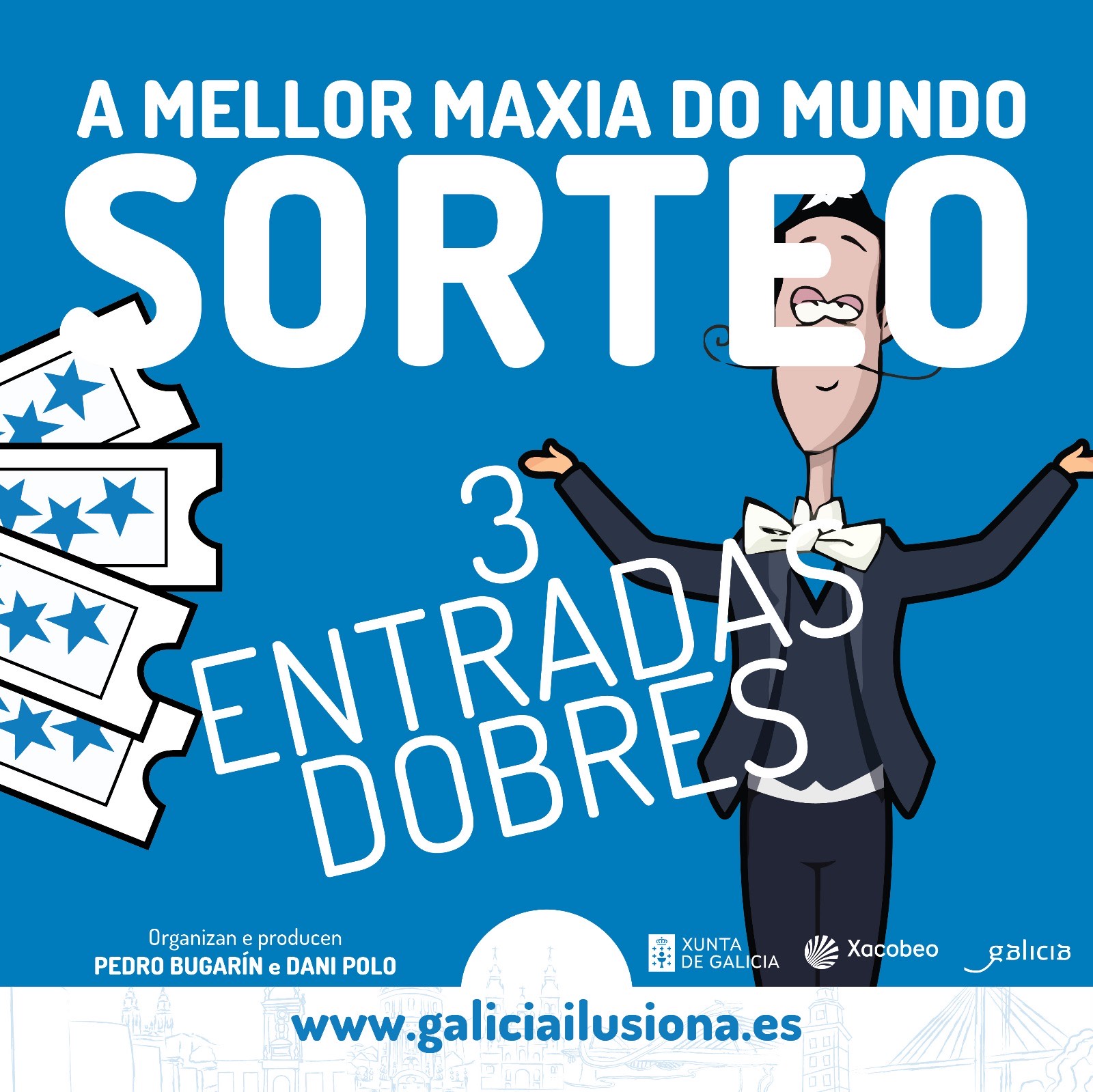 A empresa GALICIA ILUSIONA S.L. con domicilio en R/ALCALDE JAVIER RODRIGUEZ PAPMPIN 35 BAIXO e C.I.F. B09779398 (en diante, “A Empresa Organizadora”) contratada pola Axencia Turismo de Galicia con domicilio en Estrada Santiago-Noia, km.3 15897 de Santiago de Compostela e C.I.F Q-1500394- J, organiza con fins promocionais o sorteo (en diante, “a promoción”) de ámbito nacional, a desenvolver a través de Internet, exclusivo para usuarios maiores de idade de acordo con o disposto no apartado de condicións para participar.