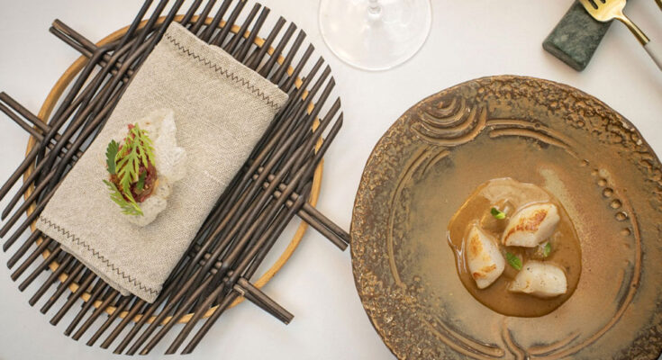 En plena Ribeira Sacra, en la Bodega Regina Viarum, Vértigo con dos Soles desarrolla una propuesta auténticamente gallega que se integra con el entorno y sorprende en cada plato.