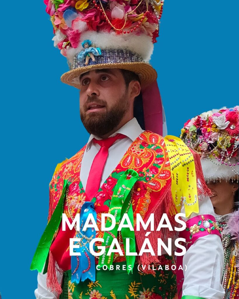 En las parroquias de Santo Adrán y Santa Cristina de Cobres, en Vilaboa, el Entroido destaca por sus personajes: las “Madamas” y los “Galáns”. Estos personajes, que van a cara descubierta, visten trajes adornados con collares y sombreros llenos de flores, plumas y otros adornos de colores. Las Madamas y Galáns realizan danzas tradicionales y participan en juegos, manteniendo vivas las costumbres ancestrales de la región. El martes carnaval es el día grande, con danzas por la mañana y juegos por la tarde, en una celebración que destaca por su folclore y participación comunitaria.