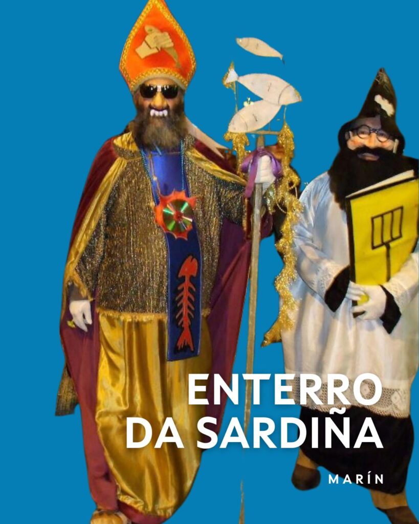 El Entroido de Marín es una celebración que destaca por su carácter cultural y tradicional, poniendo en valor costumbres ancestrales como el velorio y las figuras de las “choronas”. Uno de los actos más significativos es el “Enterro da Sardiña”, declarado Fiesta de Interés Turístico de Galicia. Esta tradición se celebra el Miércoles de Ceniza, comenzando con el velatorio de la sardina en el Palco de la Música desde las 17:00 hasta las 20:00 horas. Posteriormente, se procede al entierro, donde la comitiva fúnebre, acompañada por las “choronas” y numerosos participantes, traslada la sardina hasta el mar para su despedida. Este evento simboliza el fin del carnaval y la despedida de la alegría festiva hasta el próximo año.