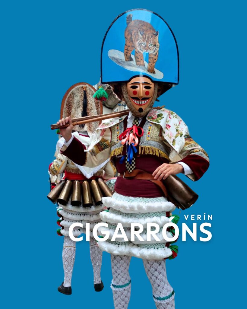 En Verín, el Entroido se extiende durante dos semanas llenas de actividades, cada una con su propio significado, como el Jueves de Compadres, el Domingo Corredoiro y el Jueves de Comadres. El protagonista indiscutible es el “Cigarrón”, cuya figura se asocia históricamente a los antiguos recaudadores de impuestos. Su atuendo es impresionante: una máscara coronada con una mitra decorada a mano, chaquetilla, camisa blanca, corbata roja, calzones con borlas y un cinturón con seis grandes cencerros que resuenan al compás de sus movimientos. Armados con un látigo, los Cigarróns imponen orden y añaden dinamismo a la festividad. El Jueves de Comadres es una de las veladas más destacadas, donde las mujeres toman el protagonismo en una noche llena de alegría y camaradería.