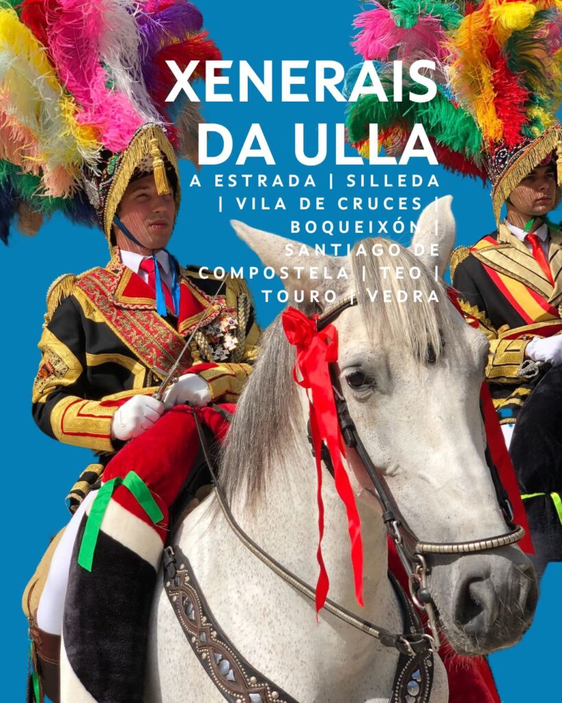 El Entroido dos Xenerais da Ulla se celebra en diversas localidades de las comarcas de Santiago, A Estrada y Vedra, entre otras. Esta festividad se caracteriza por la figura de los “Xenerais” (Generales) y sus acompañantes, quienes, ataviados con vistosos uniformes militares de época napoleónica, recorren las parroquias a caballo. Uno de los momentos más destacados es el “atranque”, un enfrentamiento dialéctico en el que dos Xenerais se baten en una batalla verbal cargada de sátira y humor, abordando temas de actualidad y asuntos locales. Esta tradición única refleja la historia y cultura de la región, ofreciendo una experiencia singular dentro del panorama de los Entroidos gallegos.