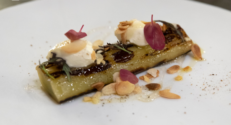 Neste caso, trátase dun porro de produción ecolóxica, confeitado ao forno e marcado con aceite de oliva e sal. Acompáñano dous grandes clásicos das sobremesas galegas, o requeixo da Capela (traballado para obter unha textura cremosa) e o mel, tamén de produción sustentable. Por riba, unhas améndoas torradas con sal e pementa e uns brotes vexetais. O resultado é un rechamante híbrido no que encaixan sabores moi marcados e elegantes. Pode parecer simple “mais é mesmo difícil de comprender, pero todo aquel que o proba, alucina. Xa o temos incorporado á carta porque merece moito a pena. O sinxelo está de volta”, conclúe Victoriano.