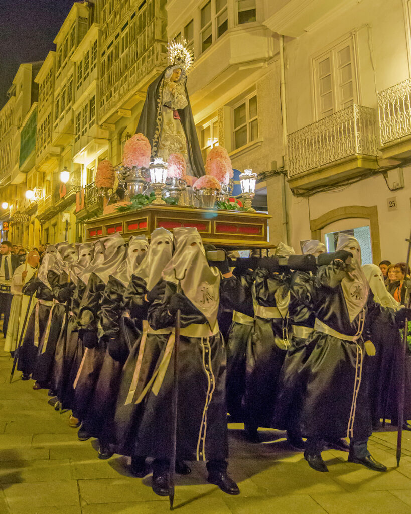 Betanzos, conocida como la “ciudad de los caballeros”, posee una Semana Santa de gran arraigo y devoción. Las celebraciones comienzan el Viernes de Dolores con una misa en honor a la Virgen de los Dolores. A lo largo de la semana, las calles empedradas del casco histórico se llenan de música sacra y procesiones que reflejan la profunda religiosidad de sus habitantes. Entre los actos más destacados se encuentra el Concierto Pregón de Semana Santa, que marca el inicio de las festividades.